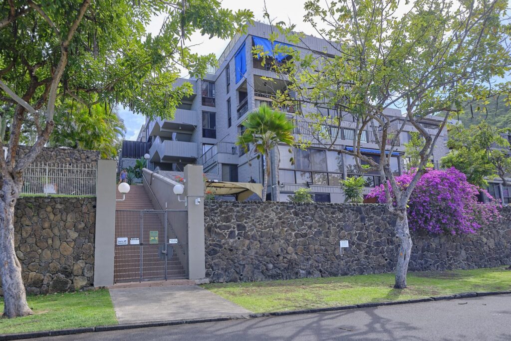 The exterior of the Dowsett Point condominium complex, shown here from its Kamamalu Avenue entrance, hides common areas in disrepair. (David Croxford/Civil Beat/2023)