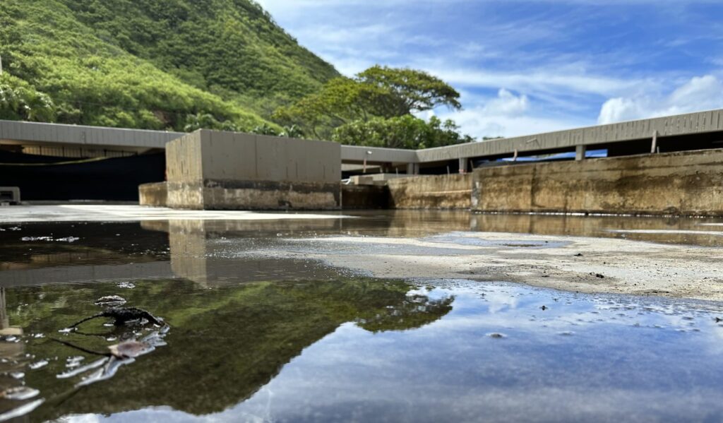 Residents say the courtyard of Dowsett Point has been in disarray for months. (Stewart Yerton/Civil Beat/2023)